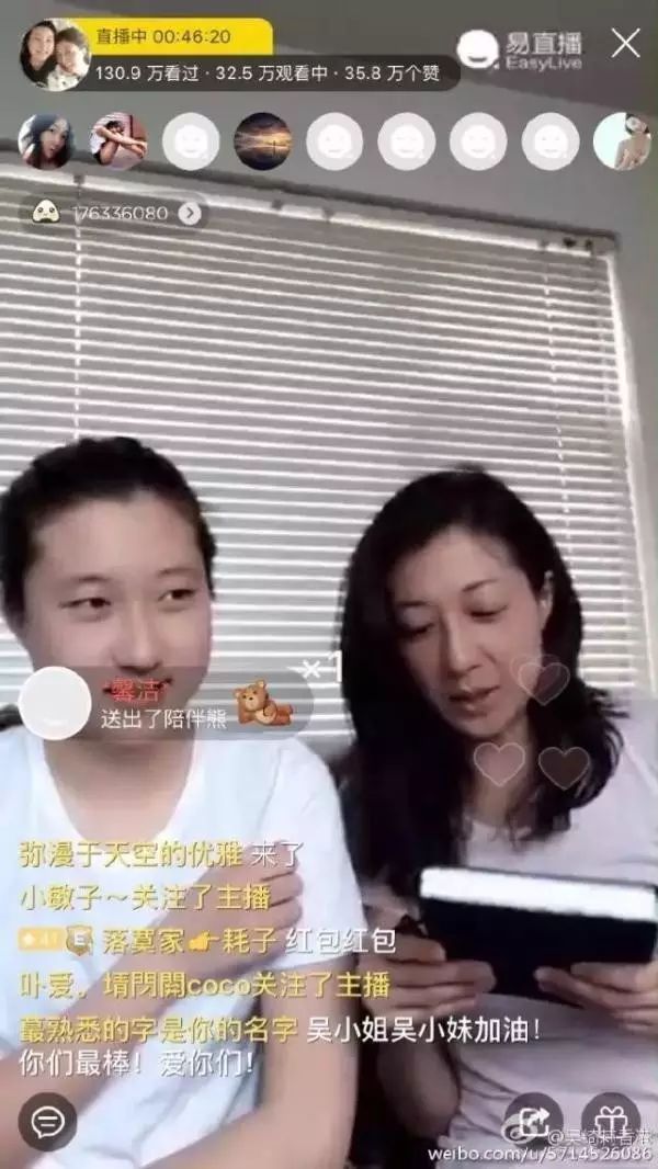 4月23日,吳綺莉帶著“小龍女”泛起在易直播。吳綺莉在微博中這樣寫(xiě):“與其被記者偷拍,躲隱藏藏,索性坦誠(chéng)相見(jiàn)。”1個(gè)小時(shí)的直播,有超過(guò)25萬(wàn)人同時(shí)收看,總觀看量超過(guò)274.3萬(wàn)。直播過(guò)程中,女兒還幫媽媽公然征友。母女倆開(kāi)心的笑顏和可愛(ài)的港普收成好評(píng)。