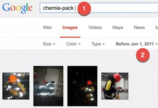 使用images.google.com,鍵入Chemie-pack (1),檢索日期設(shè)置在2011年1月(2)以前。得到的結(jié)果有數(shù)百?gòu)垐D片,這些圖片是大火發(fā)生前幾天,去工廠參觀的集團(tuán)發(fā)布的。 在一些圖片中,你可以看到化學(xué)藥品和它們的名字。通過這些圖片我們可以確定大火前工廠里儲(chǔ)存的一些化學(xué)品。 在這個(gè)例子中,你通過Google搜索到的大部門圖片已經(jīng)被上傳的用戶刪除了。假如不使用Google,你將無法看到它們。 特別建議:假如想按照日期來查閱Google的索引信息, 1.使用搜索工具Search Tools->Custom Range and type 1/1/1000 2.按照日期進(jìn)行排序。