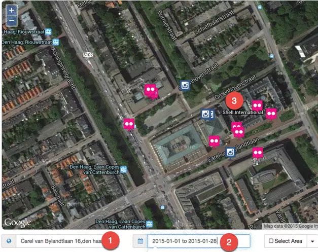 你可以在網(wǎng)站尋找信息,來分析你要研究的對(duì)象。鍵入你要檢索的樞紐詞(1),選擇時(shí)間(2),你可以看到其他人在Twitter上傳的有關(guān)圖片(3)。 假如你要搜索一個(gè)特定的時(shí)間,你還可以通過期間菜單的“Specific Range”選項(xiàng)設(shè)定你需要的時(shí)間。 7.使用Echosec 或者Geofeedia來確定人物和位置