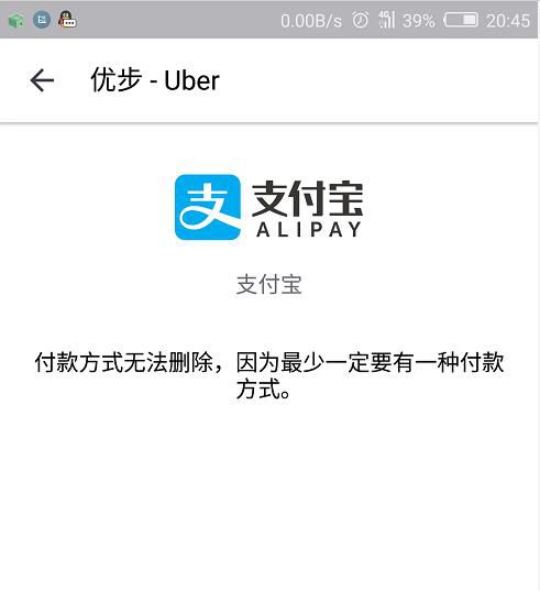 優(yōu)步還要求必需要有一個付款方式,所以我無法解綁全部支付方式,解除了支付寶和銀行卡后,還留下了沒有錢的百度錢包。
