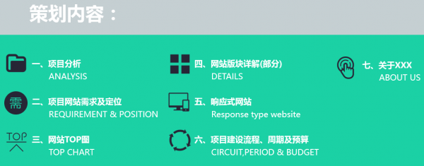 這部門展示我們針對(duì)客戶需求所進(jìn)行的大體規(guī)劃,常見的內(nèi)容包括項(xiàng)目分析、網(wǎng)站需求及定位、網(wǎng)站TOP圖、板塊詳解、響應(yīng)式網(wǎng)站特色、項(xiàng)目建設(shè)流程周期及預(yù)算、關(guān)于我們等。詳見下圖