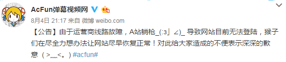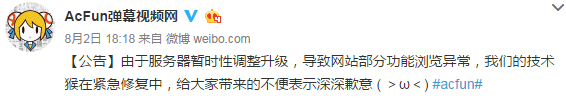 A站2016年8月2日就在官方微博上表示,因為A站服務器暫時性調(diào)整進級,導致網(wǎng)站部門功能瀏覽異常,A站的技術職員在緊急修復中,給大家?guī)淼牟槐惚硎旧钌钋敢狻?/p>