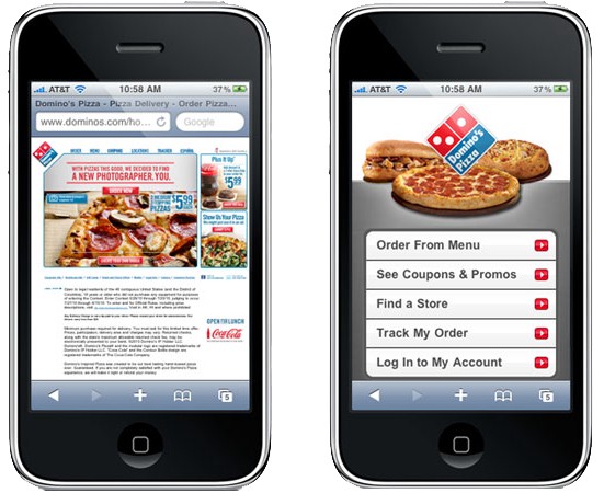 桌面端網(wǎng)頁在移動端設備上首要的障礙就是導航的使用?纯聪旅鍰omino批薩的案例,它的桌面端和移動端網(wǎng)頁的對比就相稱顯著,移動端頁面經(jīng)由優(yōu)化之后的體驗就完全不同。簡樸說來,優(yōu)化后的移動端頁面更加干凈,有著更輕易導航的CTA按鈕