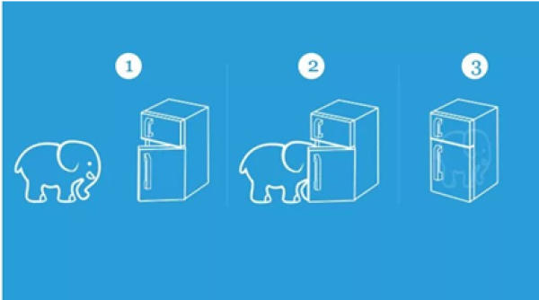 在討論谷歌圍棋AI及其比賽題目之前,我們先看那個聞名的笑話“把大象關進冰箱要幾步“,2000年中國春晚,趙本山、宋丹丹的小品《鐘點工》,曾經用到了這個笑話:問“把大象放進冰箱總共分幾步?”答:“三步,第一步把冰箱門打開;第二步把大象放進去,第三步把冰箱門帶上”。