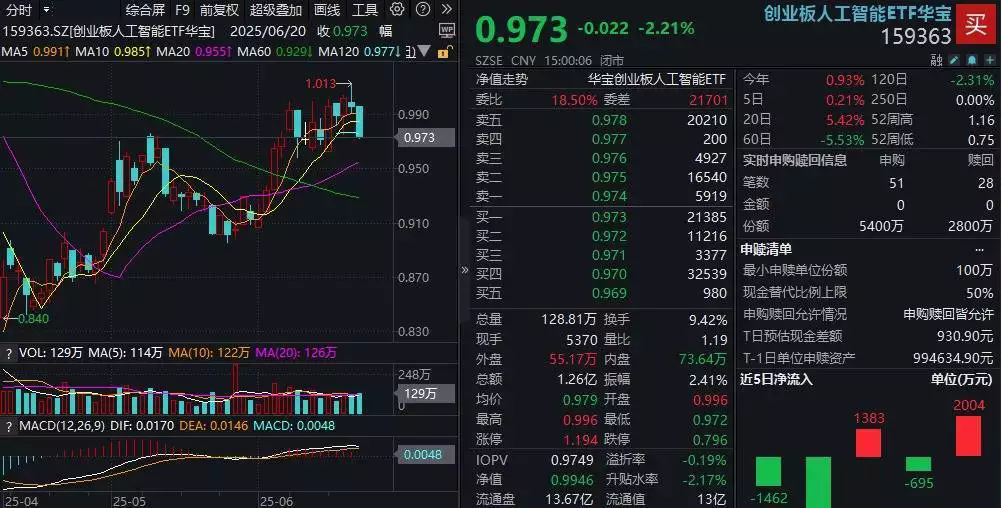 一、周五(6月20日),A股縮量震蕩,科技股全線走低。AI應(yīng)用領(lǐng)跌原因:短期遇冷與結(jié)構(gòu)性挑戰(zhàn) 市場(chǎng)表現(xiàn) 創(chuàng)業(yè)板人工智能ETF(159363):