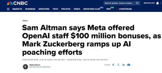 6 月 21 日消息,OpenAI 首席執(zhí)行官薩姆・奧爾特曼(Sam Altman)周三表示,Meta 曾向某 OpenAI 員工開出 1 億美元(現(xiàn)匯率約合 7.18 億元人民幣)獎(jiǎng)金來(lái)挖人,但未能成功。事件核心解讀