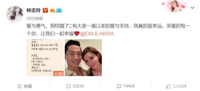 宅男心中的女生志玲姐姐宣告成婚了!皭叟c勇氣,我成婚了。有我們一直以來的愛與支持,我真的很走運。親愛的每一個你,讓我們一同美好!