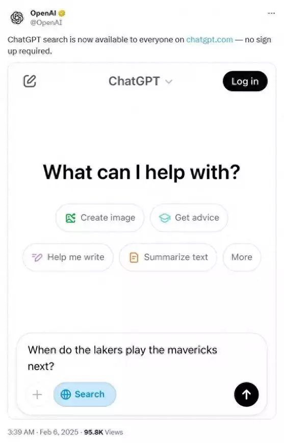 2025 年 2 月 6 日凌晨 3 點,OpenAI 宣布向所有用戶開放 ChatGPT 搜索功能,且無需注冊。這一舉措可能對谷歌等傳統(tǒng)搜索引擎造成沖擊,給搜索引擎市場帶來多方面變革,