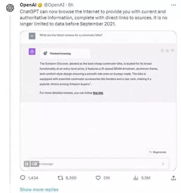 9月28日 消息:OpenAI今日宣告,ChatGPT現(xiàn)在可以閱讀互聯(lián)網(wǎng),供給最新、最權(quán)威的信息,并直接鏈接到源。它不再局限于2021年9月以前的數(shù)據(jù)。