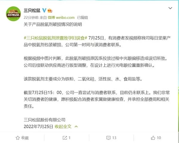 7月25日消息,一位顧客發(fā)視頻稱懷孕的老婆吃了半包三只松鼠堅果后,發(fā)現(xiàn)食品袋中的脫氧劑泄露。對此,三只松鼠稱此脫氧劑破損原因系投進(jìn)過程中光眼偏移形成誤切所造成的。