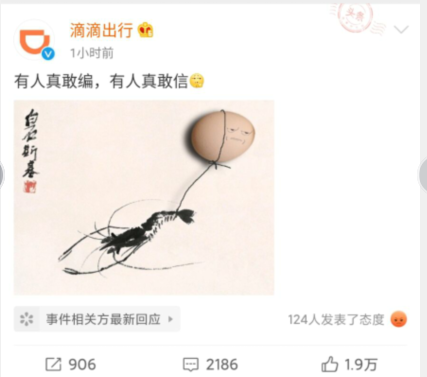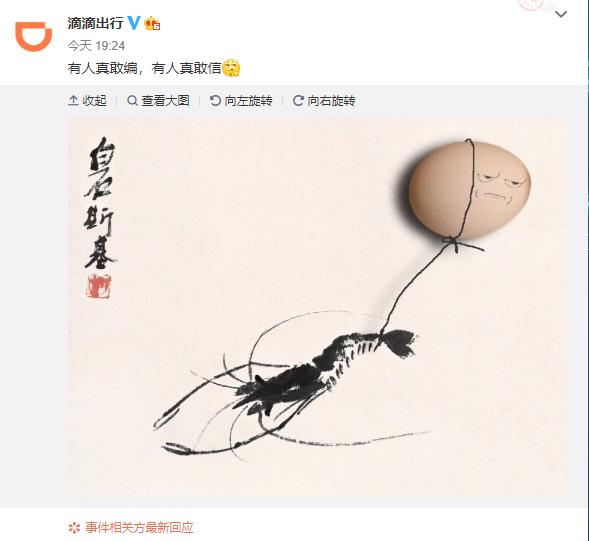 6月11日晚間,@滴滴出行 官方微博發(fā)布了一則很奇怪的微博,文字稱(chēng)“有人真敢編,有人真敢信”,并且配上了一個(gè)摳鼻的表情,和一張“蝦扯蛋”的圖片。