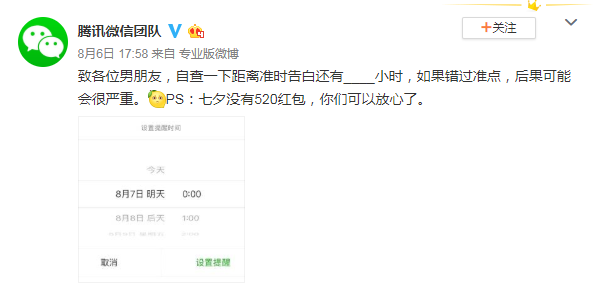 騰訊微信團(tuán)隊微博消息,本年七夕沒有520紅包。