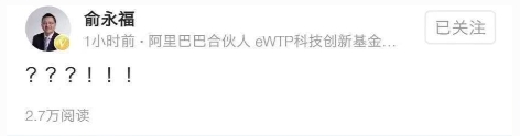 就在楊偉東的新聞爆出后,外界發(fā)現(xiàn)前阿里巴巴集團(tuán)大文娛董事長(zhǎng)俞永福發(fā)了一個(gè)狀態(tài),一個(gè)字沒寫,只有三個(gè)問(wèn)號(hào)和三個(gè)感嘆號(hào)。
