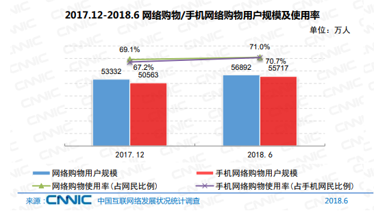 到2018年6月,我國(guó)網(wǎng)絡(luò)購(gòu)物用戶規(guī)劃到達(dá)5.69億,相較2017年底增加6.7%,占網(wǎng)民整體份額到達(dá)71.0%。