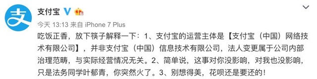 今日支付寶對(duì)外宣告,法人將從馬云變?yōu)槿~郁青。一時(shí)間引起很多網(wǎng)友的強(qiáng)烈反響,當(dāng)中最大的聲音便是:“花唄不必還了?”