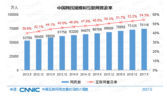 7 51億網(wǎng)民!到 2017年6月,我國互聯(lián)網(wǎng)普及率現(xiàn)已到達54 3%,非網(wǎng)民還有6 32億。昨天下午,我國互聯(lián)網(wǎng)絡信息中心(CNNIC)發(fā)布第40次