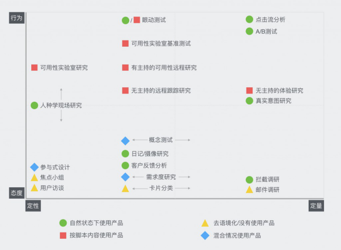其實(shí)用戶體會(huì)研討辦法有許多,這兒給咱們說四點(diǎn),便是咱們能夠從四個(gè)維度——情緒VS行為、定性VS定量、運(yùn)用場(chǎng)景以及產(chǎn)品開發(fā)所在的階段來進(jìn)行考慮。 下圖是最常用的20種用戶研討辦法的散布: