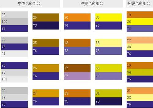 純藍和一些紅色結(jié)合在一起會發(fā)生藍紫色的感覺,這是色相環(huán)上最深的顏色。這類顏色調(diào)配可象征權(quán)威,表現(xiàn)出皇家的氣度,就象夏日的梅子,有莫測高深的藍黑,藍紫和它的補色——黃橙調(diào)配起來,