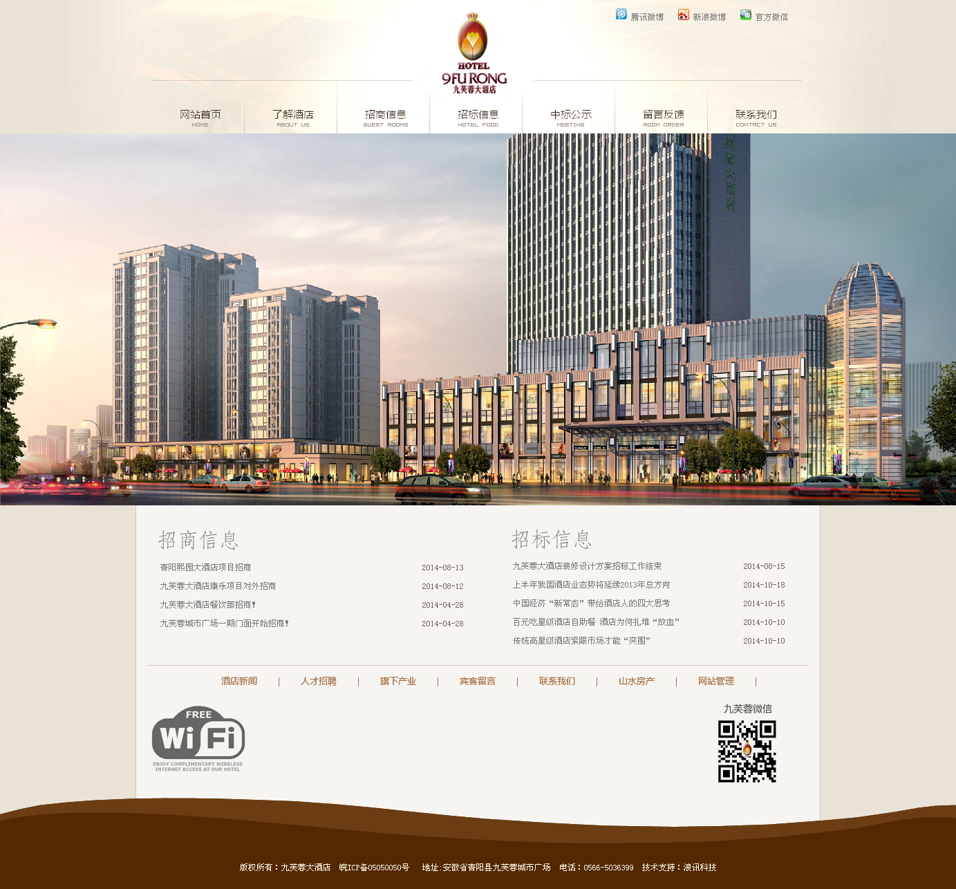 九芙蓉大酒店位于青陽縣縣城中心廟前路與西峰路交口的九芙蓉城市廣場中、青通河畔,大樓層高十九層(地下一層),建筑面積28139 2㎡,高度約80m,為青陽