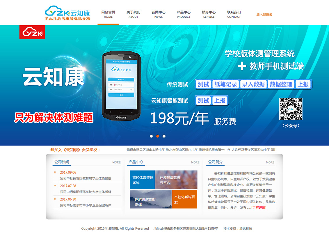 安徽科昶健康信息科技有限公司是一家擁有自主核心技術(shù)、自主知識產(chǎn)權(quán),致力于發(fā)展健康產(chǎn)業(yè)的創(chuàng)新型高科技企業(yè)。集研發(fā)和銷售于一體,立足于體質(zhì)測試、健康檢測、體育健康教學(xué)、管理領(lǐng)域。公司自主研發(fā)的“云知康”學(xué)生體質(zhì)健康管理系統(tǒng)采用先進(jìn)的云平臺(tái)技術(shù),是集數(shù)據(jù)采集、統(tǒng)計(jì)、分析、發(fā)布、健康指導(dǎo)的學(xué)生體質(zhì)健康綜合管理云平臺(tái)。
